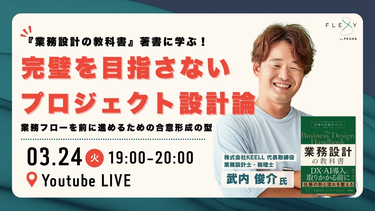 本ウェビナーでは、『業務設計の教科書』の著者武内俊介氏が登壇。正論だけでは突破できない現場の壁をどう乗り越え、関係者全員を「同じ土俵」に立たせる合意形成を導き出すのか、その具体的な手法を紐解きます。